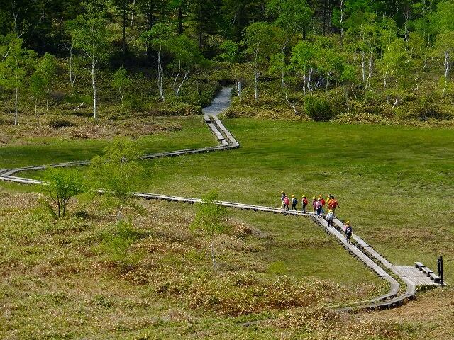 ●志賀高原、高台に登ると新緑の中を通る木道がきれいな田ノ原湿原がよく見えます。2017.6.14